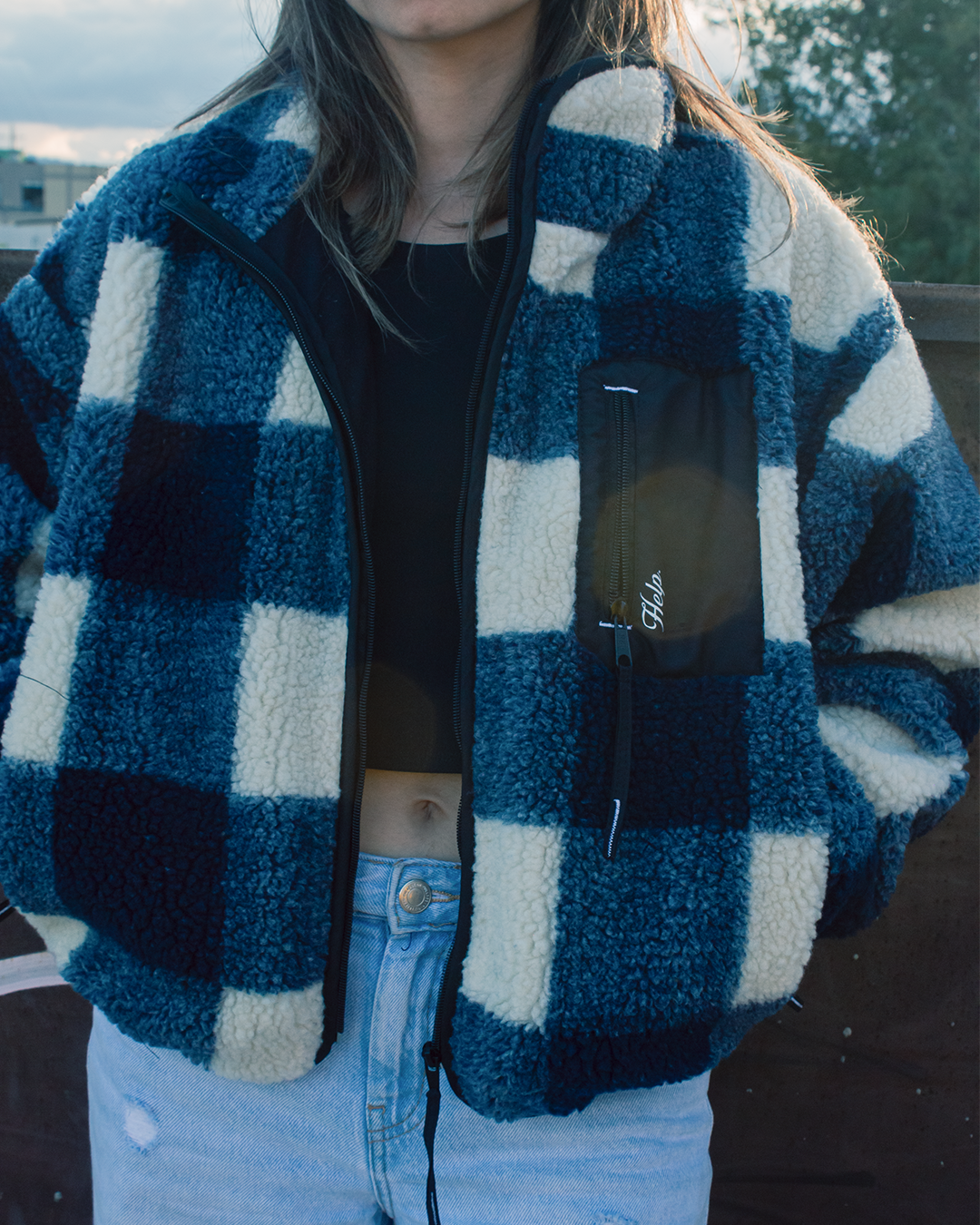 Su diseño a cuadros le da un look moderno y atemporal. Incorpora cierre frontal completo, cuello alto para mayor protección contra el frío y bolsillos con cremallera, incluyendo un bolsillo superior con detalle HELP que aporta identidad y funcionalidad.